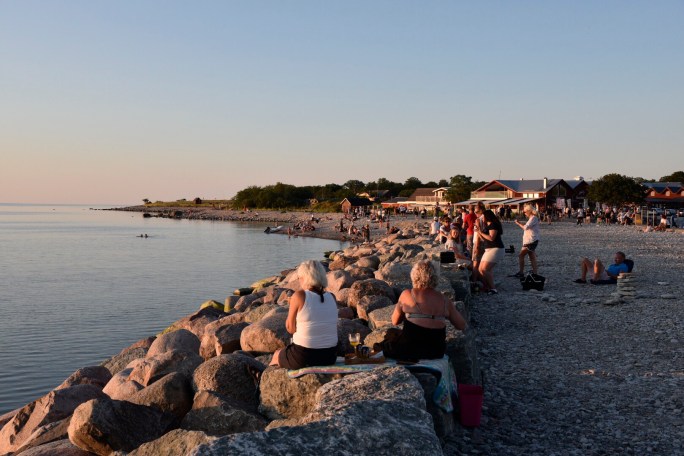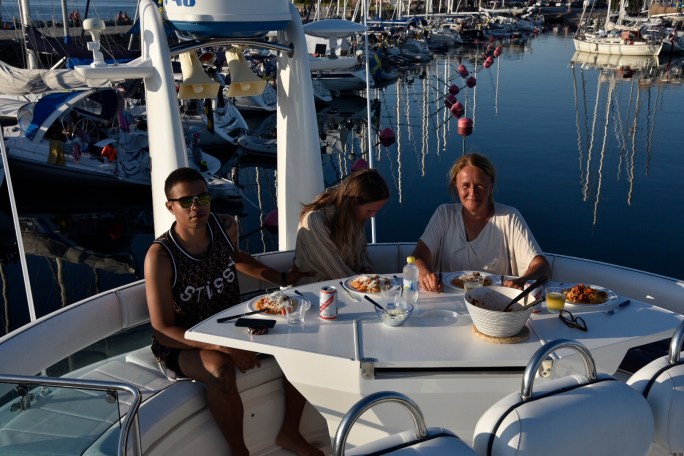Havet låg som en spegel och jag undrar om det inte var semesterns varmaste dag. Vi fick en bra långsidesplats ute på piren, senare under dagen bordades vi av två större motorbåtar. Blev mest sol och bad under eftermiddagen, middag på fly där det fläktade lite. Kvällen avslutades med en fantastisk solnedgång och kortspel ombord. En bra dag!